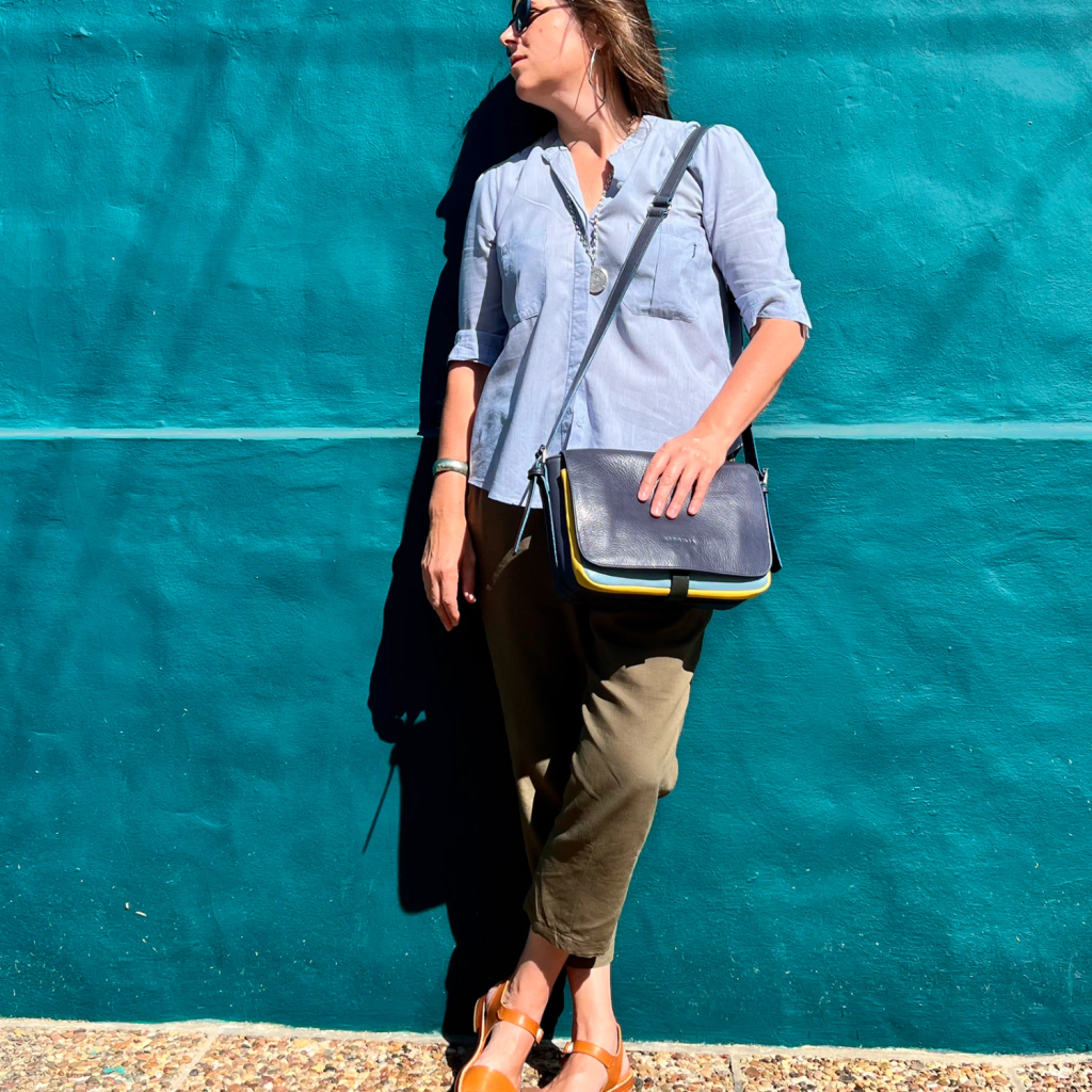 Bandolera de cuero Verona azul combinada. Cartera 100% Cuero vacuno argentino.
