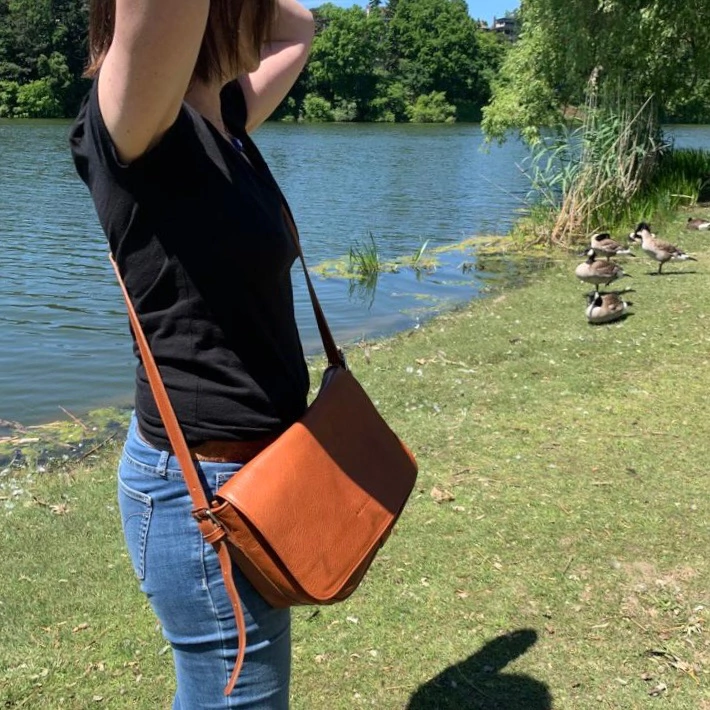 Original y cómoda bandolera de cuero, con imán y cierre principal para acceder. Base amplia. Bolsillos exteriores planos delante y detrás, con imán. Más dos bolsillos dentro, con cierre y sin cierre. El interior se encuentra forrado en tela y cuenta con práctica tira con mosquetón portallaves. La correa larga es regulable.