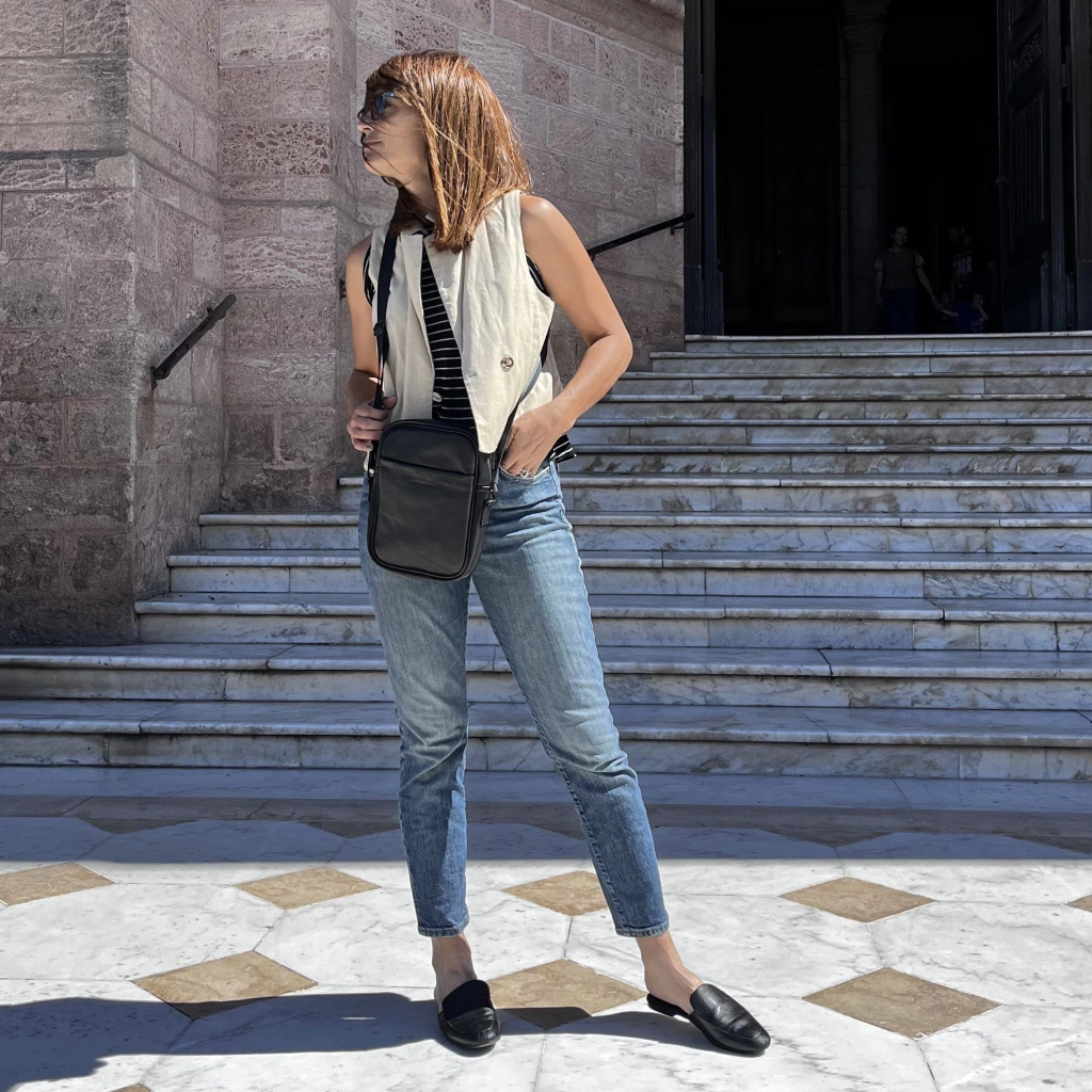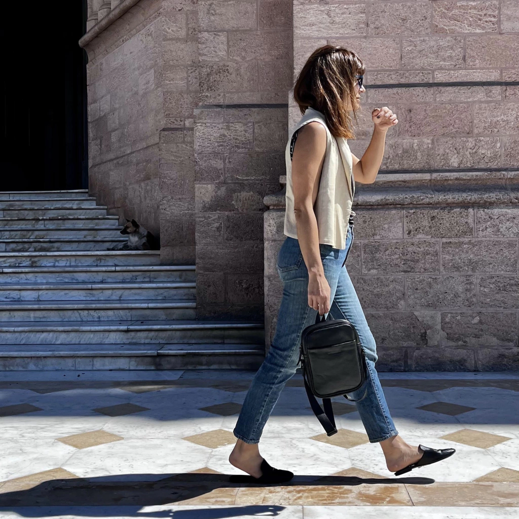 Morral de cuero negro Cefalu. Unisex. Morral 100% Cuero vacuno argentino.